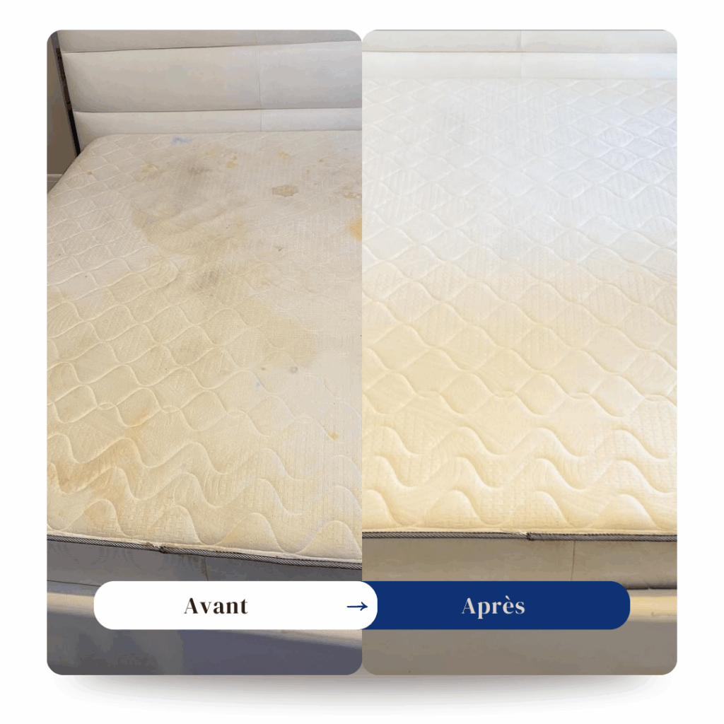 Notre méthode permet d’éliminer les taches, de supprimer les mauvaises odeurs (transpiration, humidité, animaux…) et de désinfecter en profondeur, sans abîmer les fibres. Résultat : un matelas propre, frais et sain, comme neuf.